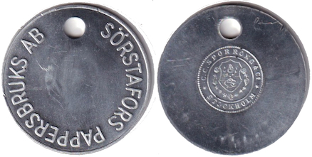 SÖRSTAFORS PAPPERSBRUK )( SpSn. Rund med hål upptill. Mässing.