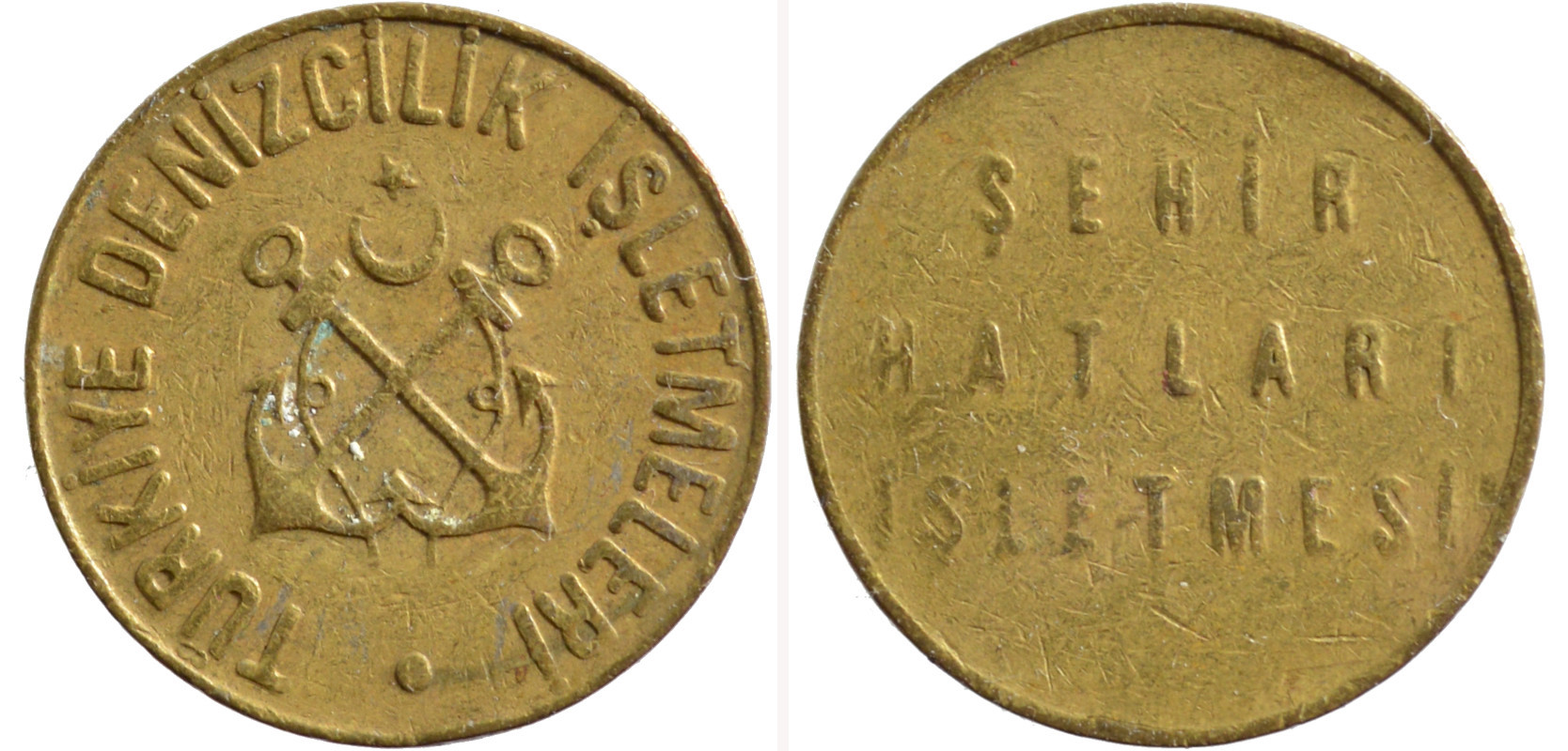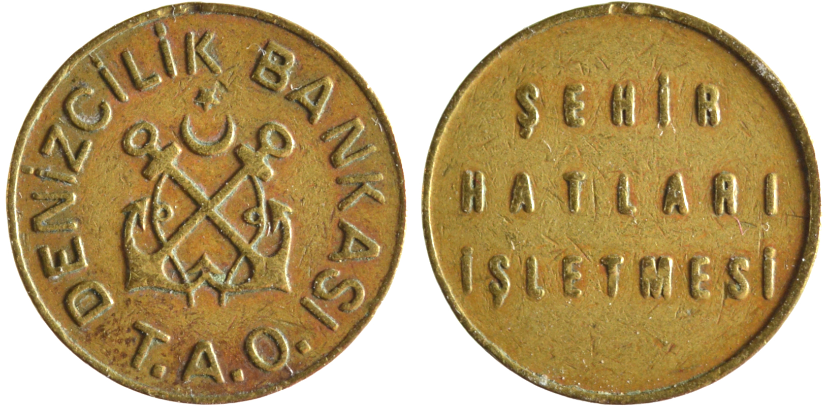 obv: two crossed anchors with half moon (opening facing up) and star – DENIZCILIK BANKASI T.A.O. (Maritime Bank) rev: SEHIR HATLARI ISLETMESI (City Lines Operations)